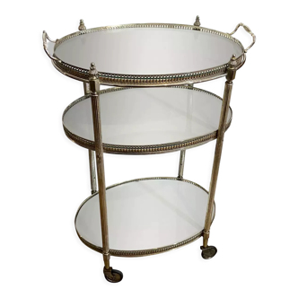 It is a small brass side table composed of 2plateaux whose bottom is made of glass; they are removable it is ideal at the level dimensions.