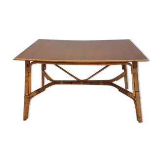 Smørrebrød coffee table with "up and down" system.1960. Teak plated tray. Very good condition, to note on the extension plated damaged on the edges but really nothing nasty. (see photos) Dimensions low position. Height 49 cm. Width 112 cm. Depth 85 cm. Position dining table. Height 74 cm. Width 168 cm. Depth 85 cm.