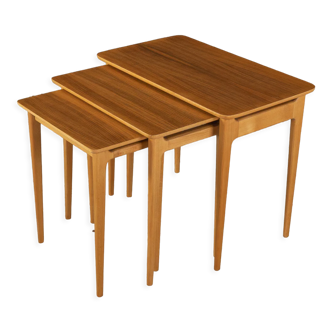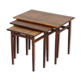 Beautiful set of side tables, 1960s. The tables have a thin black iron structure with teak trays.