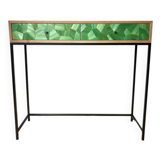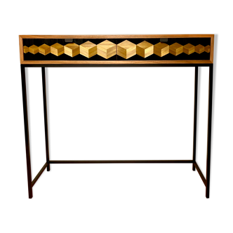 This console is intended to be elegant and functional. Thanks to its two full-extension drawers mounted on invisible slides with shock absorbers, this console offers you significant storage space for your entrance or living room. The facades were worked in straw marquetry, with a pattern based on cubes of bronze-tinted oeben in perspective, to play on relief and depth. The black rye straw background leaves plenty of room for the pattern. The box is in walnut with an oil-wax finish. Its 16mm black metallic steel base provides finesse and stability. Straw marquetry facades require rare and precious know-how because it requires patience, rigor and precision. The unique reflections of straw will illuminate your interior because this material, natural in essence and luxurious, plays with light like no other. The box veneered in real French walnut (6/10) will add the softness of the wood. Unique dated and signed piece made in France by bcmobilier for a sustainable and eco-responsible approach.