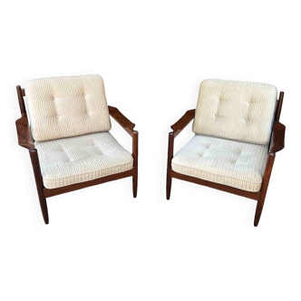 Pair of rattan armchairs, crafted in the 1960s–70s, with a simple and balanced design. In good usable condition, with a beautiful patina consistent with their age. The original seat is made of old straps. As these show slight wear, a reinforcing plate has been added under the seat to ensure comfort and sturdiness. The fabric is original; cleaning may be considered depending on the intended use. The set is stable, sound, and without damage.