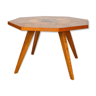 French solid pine hexagonal side or coffee table from the 1970s. In good vintage condition.