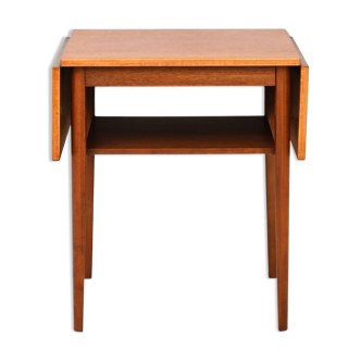 Bedside table with a drawer, dating from the 1960s. Oak veneer body; solid wood legs. Good structural and cosmetic condition (the entire piece has been sanded and then varnished with a professional light beech finish varnish); a few very discreet veneer losses on the edges. Dimensions: width 480mm; depth 320mm; height 580mm. Drawer dimensions: width 410mm; depth 200mm; height 65mm. Nook dimensions: width 440mm; depth 300mm; height 165mm. Delivery in Paris is also possible for €30 (approximately every 6 weeks; please contact me).