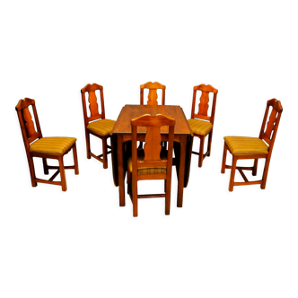 Compact scandinavian pine and rope dining set. The square table has a top that folds and slides out to double the size. The chairs are made from pine with sculpted backs and rope seats. All in good used condition with age consistent signs of wear and use. Ideal set for a small room or tiny house. Table: W. 64/128cm. D. 80cm. H. 72cm. Chair: w. 49cm. D. 48cm. H. 75cm. Seat. 42cm.