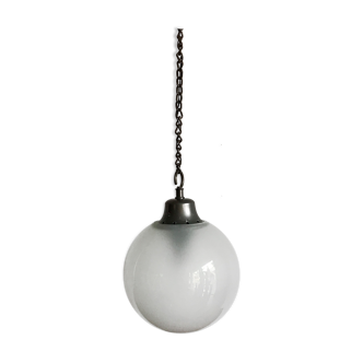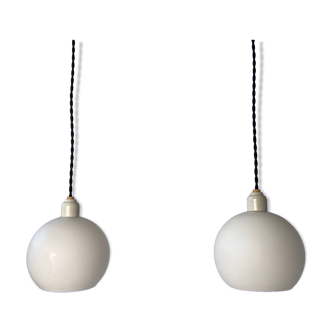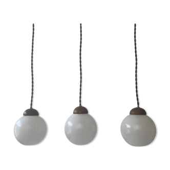 Lot of 3 small hanging in opaline and brass. Electricity is refurbished with black thread in twisted fabric. porcelain fastening rosace. E14 bulbs. Ideal for lighting a worktop or bar. Opaline diameter: 11 cm. Rose diameter: 5.5 cm. Rose height: 4 cm. Wire: 0.80 m. Weight: 1.17 kg.