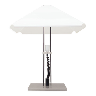 Large "mushroom" lamp in metal and acrylic, 1970s/80s. On a side table or a sideboard, this lamp will quickly find its place in an interior that appreciates 1970s design. Made entirely of black metal with a well-made acrylic shade, it diffuses a beautiful light. Dimensions: Height 60cm. Base diameter 20cm. Shade diameter 40cm. Vintage item in good condition for its age. Note: slight signs of wear. See photos.