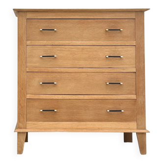 This large vintage chest of drawers from the 1970s captivates with its timeless look and elegant simplicity. Both sturdy and refined, it perfectly embodies the spirit of period furniture updated for modern tastes. Features: this large vintage chest of drawers from the 1970s opens with four spacious drawers, each equipped with two original brushed metal knobs. Renovation: the chest has been gently stripped and treated with natural products to remove the glossy finish of the original varnish. It has then been carefully washed, fully nourished with linseed oil, and polished. Dimensions: L90 X D40 X H98. Drawers: L75 X H13. Elegant and functional, this large vintage chest of drawers will add a vintage touch to your interior, whether displayed in a bedroom, hallway, or living room. A piece full of character, ready to stand the test of time with style.