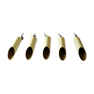 Size XL. Designer Komulainen Maija Liisa. Published by Raak in 1970. No longer published today. Pink/copper-look metal shaft, white lacquered interior diameter 9cm. Wall lamp height 60cm. Two e27 porcelain sockets. Electricity revised, some scratches, traces of use, but good overall condition.