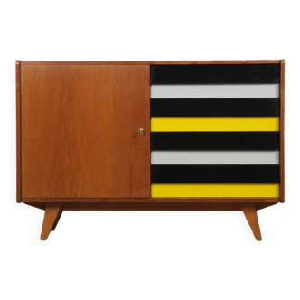 This oak sideboard is designed by Jiri Jiroutek. It is the U-460 model. It is published by the Czech manufacturer Interier Praha in the 1960s. This piece of furniture consists of a series of 4 black, white and yellow drawers. This piece of furniture is in good vintage condition. The top is restored. D1141