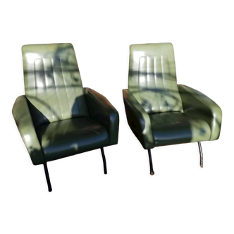 Pair of lounge armchairs, vintage. Seventies. Cognac color. Metal frame and base, black. Very comfortable seat because ergonomic model.ditto for the backrest. Nevertheless, the seat is relatively low (30cm), so this chair is not suitable for people who have trouble sitting or at least getting up. Size: 76 height. 57.5 width. 55 depth. Details. Backrest: 44 height. Seat: 55 depth. Height 45. Seat thickness 11. Feet: height 29 in front. 31 behind.