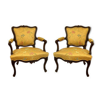 False pair of louis XV period convertibles in beech with walnut patina, the difference is only in the height 86 and 89 cm, molded and carved with florets in the backs and sleepers, seat height 43 cm, mid-eighteenth century era, set in good condition.
