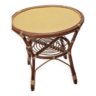 Real rattan pouf in vintage natural rattan creation kok 1967 (rattan specialist since 1920) which takes up the aesthetic codes of this time with its pretty honey blond color: natural rattan structure, characteristic rattan bending and pretty arabesques. Symbol of the relaxation of the late 60s and the arrival of a new exoticism. Robust, this pouf will be ideal as a stool as is or by placing a round cushion on it, plant holder or side table by adding a glass top. A beautiful classic that will find its place everywhere in a vintage, bohemian or Scandinavian decoration. In good general condition with its beautiful patina and its small defects of time. The kok brand continues to reissue it at a selling price of 106 € at the b.h.v for example. Unique piece. Dimensions: height 40 cm - width 37 cm - depth 37.