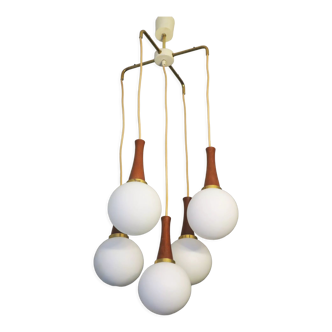 Teak chandelier and opaline balls from the 1960s.