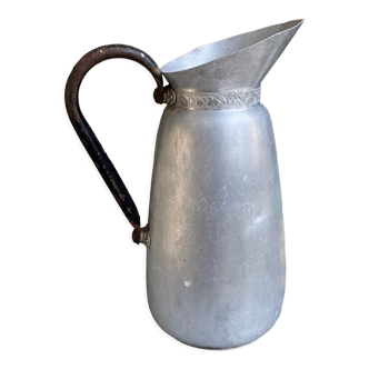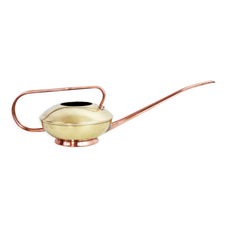 Copper decanter with spout. Wood grip, hammered pink copper decanter body and yellow copper body base.