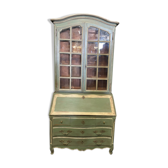 English light wood scriban, two glass doors on the upper library (with lock and key), a secretary door underneath with storage (with lock and key), a drawer underneath with two handles and finally two doors for the bottom storage part (lock to review and no key) Lead-mounted light and green stained glass windows in excellent condition. Depth biblio 22cm.
