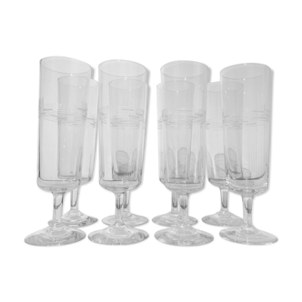 Box of 6 daum crystal flutes. Sorcy model. Like new, some labels are still on the glasses. Very good condition, no cracks. Neck diameter 60 mm, diameter feet 38 mm, height 145 mm. Weight 2000 grams.