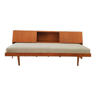 Beautiful mid century daybed from the sixties. The daybed has a natural scandinavian look due to the use of high-quality teak veneer and a sleekly designed design. The conical wooden legs give the daybed extra cachet. The daybed has two compartments with flaps that are located above the bed, as a wall cabinet. This creates a sofa and therefore the possibility to use it as a sofa. By pulling the seating area forward, a single bed is created. Dimensions: 200x74x90cm (width, depth, height). Dimensions mattress: 90x193cm. In good condition. The original mattress cover shows signs of age. You can optionally put a new loose sheet cover over this as shown in the photo (the cover in the photo is included).