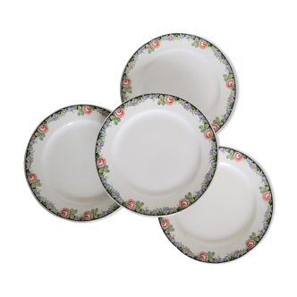 Set of 4 hollow plates in hand-painted porcelain signed mr. Pellet. Floral decoration in frieze in purple blue and green tones. One of the plates looks slightly smaller (by a little). Diameter 24 cm.