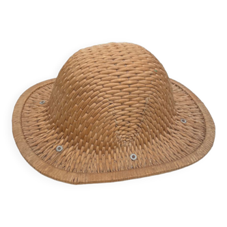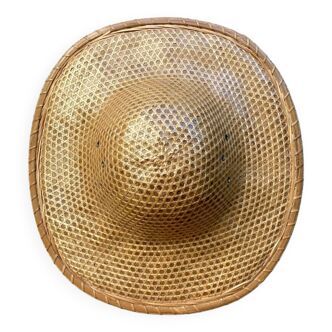 Sublime old asian hat in hand-woven paper and wicker. This pretty hat is very decorative today and it can be part of a wall composition for example or simply placed in a room. Hanging on the wall with baskets, or wicker basket it will be very beautiful. Both bohemian and vintage, this hat will fit into many interiors! Dimensions: 32.5 X 34.5 X 12 cm thick weight: 200g.