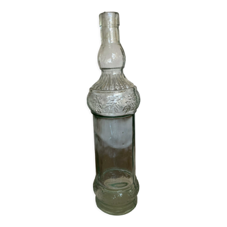 Glass bottle in a magnificent turquoise blue, with multiple reliefs. It is 32 cm high with a diameter of 7 cm. It has its original cap and will enhance your decoration.