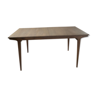 Rosewood veneer dining table with two extension leaves. Probably from germany. The top has been sand and laquered. On extension leave has a small chip from the edge.