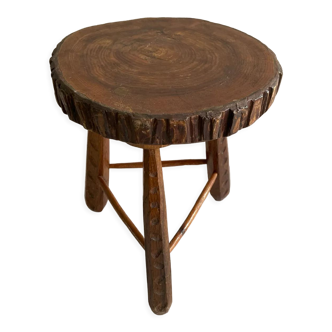 Vintage tripod stool. Made of light-colored wood. Tree branch-shaped legs. Seat diameter: 27.5 cm. Base diameter: 29 cm. Height: 42 cm. Can be used as a sofa end table, nightstand, plant stand, etc. Lots of charm.