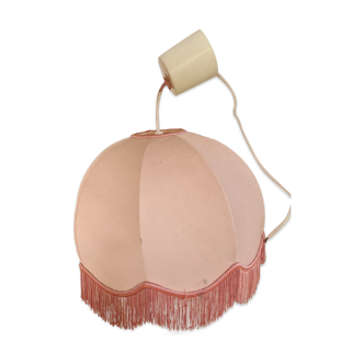 Beautiful and original vintage suspension in beige fabrics of floral shape gloved with a delightful stripe in trimmings tone on tone of the 1960s 1970s. In a very good state of conservation, it will give a touch both vintage and elegant to your decoration. Typical of this era, it is lined inside by an amber plastic coating in perfect condition, which brings a warm and subdued light. The top that hides the electric wire is shaped like a matte white geometric drop for a very nice finish. The most beautiful effect once installed. Origin France.