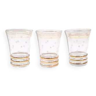 A nice retro look for this set of 6 old glasses, from the 40s and 50s, in transparent glass enhanced with 6 gold stripes. Dimensions: height 9.6 cm, diameter drinking 7 cm. In very good condition, beautiful shine. Note, gilding well present but slightly blurred on some strips (see photo).