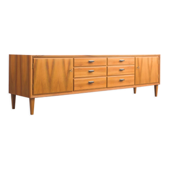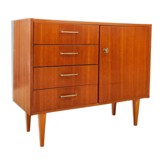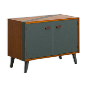 Size: – length: 59 cm. – depth: 34.5 cm. – height of the feet: 15 cm. – total height: 51 cm. Materials: – drawers in teak tinted oak veneer. – box and door painted in a blueberry tint. – solid oak base teak. Finishes: matte colorless varnish. Pretty pair of vintage bedside completely restored and redesigned to offer them a second youth. The body and doors were painted in a blueberry hue. The solid oak compass feet have been covered with a teak tinted varnish that goes perfectly well with the composition of these bedside tables.