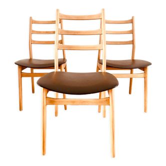 Set of 6 chairs from the 1960s-1970s, Denmark. Manufacturer: Korup Stolefabrik. The design is often attributed to Kai Kristiansen. Solid teak frames. Original upholstery without defects. Deluxe finish with genuine black leather (at that time in Denmark, Skai/imitation leather was more commonly used). Overall dimensions: approx. 98 X 47 X 53 cm (height/width/depth). Seat height: approx. 45cm. Used items. Despite their age, only slight signs of aging/wear. See photos. No defects.