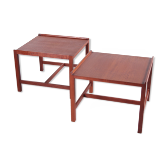 Series of 2 teak trundle side tables; manufacturing from the 60s. Good general condition (structure and tray sanded and then protected by a colorless matte vitrifier); good manufacturing quality; the large models show traces of wear of the veneer on top (see photos); the second model is in perfect condition. Size: Average: length 545mm; width 375mm; height 465mm. Large: length 575mm; width 400mm; height 500mm. Price shown for both tables.