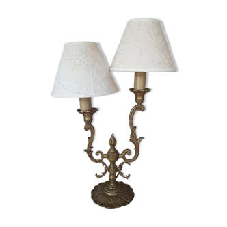 Vintage ceramic lamp 50s in very good condition. Pink satin lampshade doubled, gold festoons. Height with lampshade 27cm. Height without lampshade 14cm. Length 23cm. Foot 14.5cm X 7cm.