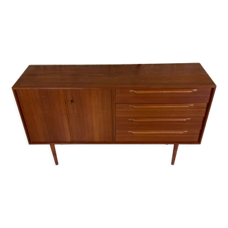 Magnificent and rare small sideboard or chest of drawers in Scandinavian style. Quality craftsmanship from the 1950s, vintage. Featuring 4 very clean front drawers lined inside and a door with a shelf. Original tapered legs, veneered in oak with a stamp on the back. In very good condition, as seen in the photos. Truly a beautiful quality piece, especially in good condition for its age. Top length 1m04. Bottom length 1m09. Top depth 42cm. Bottom depth 44cm. Height 89cm.
