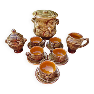 Coffee service luc vallauris. Elegant coffee service luc de vallauris including 4 cups and saucers, 1 sugar bowl and saucer. A lot of charm with its bright colors in enamelled earthenware. To report a splinter glued on a cup but which does not take anything away from the charm of this service. Sugar height 18cm. Cup 5cm high 8.5cm diameter sub-cup 13.5cm diameter.