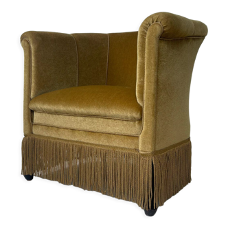 Armchair in very good overall condition. Firm and comfortable seat. There are three small stains at the top of the backrest. Seat height 32cm. The fabric is heathered, giving it a pinkish-beige tint. Very high quality fabric and workmanship.