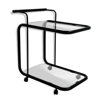 Elegant 1970s food trolley made of chromed steel with three smoked glass shelves. The sinuous and minimal design recalls the modernist style typical of the period, with a continuous tubular structure and soft corners that provide visual lightness and functionality. • Period: 1970s • Materials: Chromed steel and smoked glass • Structure: Continuous tubular structure with rounded corners • Shelves: Three levels, ideal for serving or displaying objects • Wheels: Small integrated wheels for easy movement • Condition: Good vintage condition, with minor signs of wear consistent with its age. A versatile piece perfect as a bar trolley, living room furniture, or decorative element for vintage, modern, or industrial style environments. Height: 62 cm Width: 50 cm Depth: 38 cm.