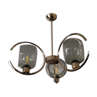 Very beautiful and fine vintage chandelier composed of 3 tulip lights in molded glass and golden support, from the 1960s, in perfect condition. Not tested.