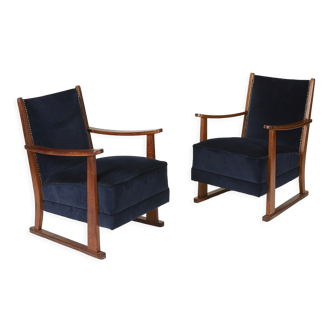 A beautiful pair of solid oak armchairs, typical of the Amsterdam School architectural style of the 1930s. Their geometric and structured silhouette, marked by straight lines and assertive volumes, perfectly reflects the expressiveness of the movement. The high, slightly inclined backs and straight armrests lend a truly sculptural presence while offering comfortable seating. The seats and backs are upholstered in a vintage gray-green fabric with a matte texture, which harmonizes beautifully with the warm patina of the oak. The armchairs rest on particularly stable frame legs, while the closed lower panels—a signature of the Amsterdam School—reinforce the overall architectural appeal. Born in the Netherlands in the 1910s and active until the early 1930s, the Amsterdam School movement initially developed in architecture before expanding to furniture, interior design, and the decorative arts. It is distinguished by a strong expressionism, where volume and sculptural dynamism play a central role. Dimensions. Height: 116 cm. Seat height: 52 cm. Width: 63 cm. Depth: 65 cm.