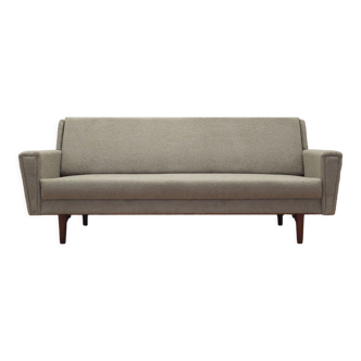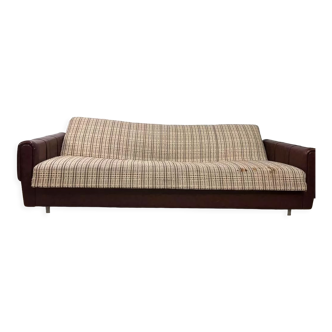 1960s convertible sofa in brown vinyl and yellow corduroy fabric. Seats 4. The sofa unfolds to create a 90 X 185 cm bed. Ample storage space under the seat. In good overall condition, with a few minor marks consistent with age and use. Length: 215 cm, seat height: 35 cm.