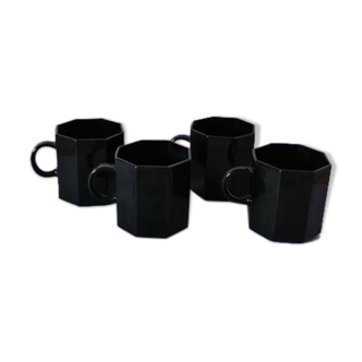 Black octime cups from arcoroc octagonal iconic 80s. High-resistance tableware in addition to its timeless design with its opaline glass. Very good condition, set of 6 cups and under cups. Cup height: 6.5 cm / cup width 5.5 cm / width under cup: 10.5 cm.