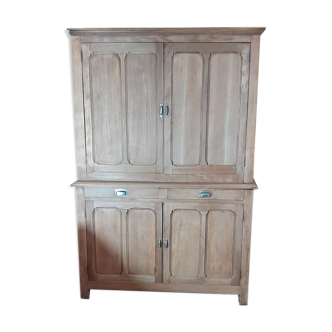 Off-white Parisian-style two-piece buffet. It features four drawers and two cupboards, each with a shelf. Refrigerator-style handles and shell-shaped drawer pulls (recent shell handles). The piece has been treated against wood-boring insects and shows signs of age (see photos).