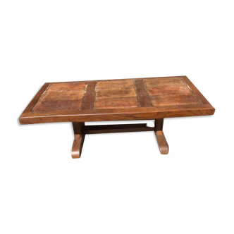 Brutalist oak coffee table inlaid with raw ceramic tiles. Signed de tonge, france, 1970s. "french excellence" is what the french "house of de tonge" is called. They have been manufacturing high-quality furniture since 1967. Dimensions: length: 134 cm width: 59 cm height: 43 cm.