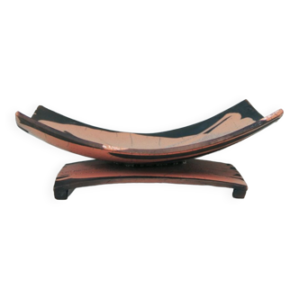 Large blackened wood basket with wickerwork. Beautifully handcrafted, combining hand-woven edges and a wooden center with inlaid mother-of-pearl geometric motifs. A decorative piece in its own right, it can serve as a centerpiece, basket, or catchall, perfect for an interior that blends raw materials and natural tones. A beautiful balance between simplicity and character. Vintage piece, in very good condition with a natural patina and imperfections due to its handcrafted nature.