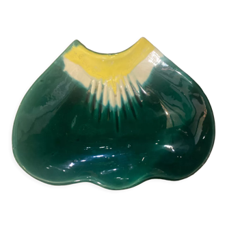 High-quality ceramic trinket dish from the 1950s. Shaped like a stylized leaf or shell, it's a deep turquoise color and enhanced with gilding. In perfect condition, no chips. A charming piece that can also be used to hold jewelry or soap in a bathroom.