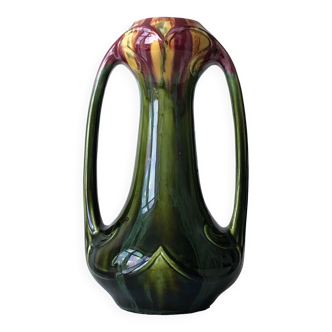 Two-handled vase in art pottery. Slender and tapered shape. Brown in color with drips, all glazed. Factory mark printed with shape number 1622 at the base. Height 30cm. base 16cm. Neck 7cm. Weight: 1660 grs.