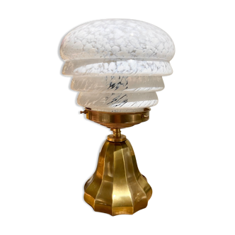 Art deco style table lamp with a chrome metal base, and a white clichy glass globe with gold edging. Very soft and enveloping light. The electrical part is new and complies with the ce regulations applicable to lighting fixtures.