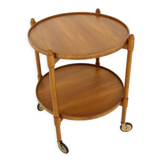Rolling rattan bar cart from the 1960s/70s. It has two shelves; the lower one shows some signs of wear, while the upper one is new. Both have been treated with a golden oak-tinted oil. It can hold up to four bottles in the designated slots. The wheels work properly. Note that one wheel is flattened (see last photo). A very decorative piece with a patina of age. It can also be used as a side table or plant stand. Rare item! Dimensions: Max. diameter 65cm x H. 80cm. Shelf diameters: 45cm and 60cm. All our furniture is restored/refurbished by us. Contact me for the actual Cocolis delivery price.