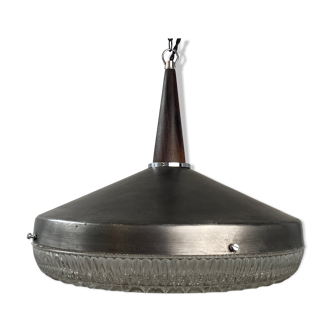 Suspension ufo, liro belgium 1970. Iconic ufo lamp produced in liro, alost belgium. The top of the lamp is made of bronze-colored cast metal, around a chrome ledge with a spatially-era design. The background is acrylic with a cut pattern. The lamp is equipped with a draw system and is complete with a ceiling cap. There is a round fluorescent lamp 40 cm in diameter, which is included. The diameter of the suspension is 43 cm and the height of 36 cm. The lamp is expandable to a maximum of 105 cm.