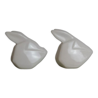 Very original! Here is a vintage vallauris ceramic composed of a leaf and a duo pepper shaker in the shape of a rabbit. Note: missing a cap on one of the rabbits... But creative diyers will find a solution. Very funny set to animate your table! Dimensions: sheet about 16x16 cm. Rabbit (large): h8 cm.