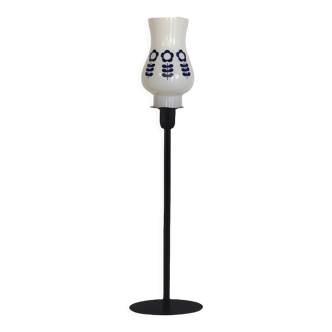 Shipping your lamp on September 3, 2025 Table lamp made with a yellow/ochre glass shade with pronounced edges decorated with fine, golden lines, in art deco style and mounted on a black metal base. Remodernized thanks to this refined base, it offers an original and unique style that makes it a decorative object to display in a living room or bedroom. The base is made of black metal. It is possible to mount this lamp on a golden base on request. Height of the lampshade: 13 cm. Total height of the lamp: 46 cm. E14 bulb, max 40w, included.